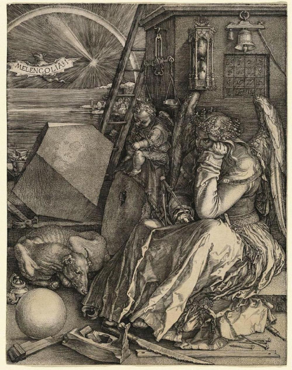 盖伦可说是希腊医学发展的高峰,此后的医家顶多只能注释或编纂盖伦及古代医学的学说而已。与《黄帝内经》和《伤寒杂病论》主导和束缚中医的发展相类似,西洋医学在接下来的两千年里再也没有创出新机。盖伦和希波克拉底得自临床与实验的医学假说竟成为取代事实的绝对真理,直到文艺复兴之后,新解剖学和细胞学说取代了早已过时的四体液学说。如今的西方医学界虽已不再谈及体液学说,但是我们在医学教科书中仍可看到“melancholia”这条术语,这无疑是四体液学说的遗迹。希腊词根melan表“黑色”,cholia表“胆汁”,melancholia?(也可拼写成melancholy或melencolia)?指因黑胆汁过多而造成的疾病?(图2),它描述的其实就是困扰当今世界近15%人群的抑郁症。
