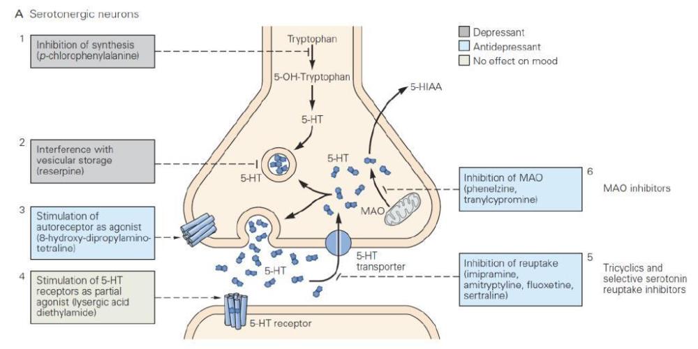 在抑郁症的病理条件下,与调控情绪有关的神经递质对突触后神经元的信号传导效率很可能偏低,也许没有必要把它们从突触间隙快速清除。沿着这条思路的后续研究果然发现,MAOI和三环抗抑郁剂?(tricyclic antidepressants, TCA)?都能提高单胺类神经递质在突触间隙的有效浓度。MAOI能抑制负责降解突触间隙单胺类神经递质的MAO酶活性,而TCA则抑制神经系统对去甲肾上腺素和5-羟色胺?(5-HT,别名Serotonin)?的回收。这使得科学家们相信,抑郁症的一个主要致病机理是病人大脑中可有效利用的单胺类神经递质浓度明显下降,该理论被称为“抑郁症的单胺假说”。
