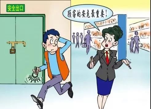 进入商场先要注意观察安全出口的位置和疏散通道,安全门,牢记箭头指示的疏散方向。
