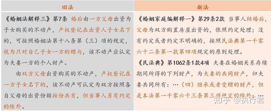 对于婚后父母出资的情形,《婚姻家庭编司法解释(一)》第 29 条 2 款修改了原《最高人民法院关于适用<中华人民共和国婚姻法>若干问题的解释(三)》第 7 条的规定,不再区分是由“一方父母出资”还是“双方父母出资”,一律规定为“当事人结婚后,父母为双方购置房屋出资的,依照约定处理;没有约定或者约定不明确的,按照民法典第一千零六十二条第一款第四项规定的原则处理。”