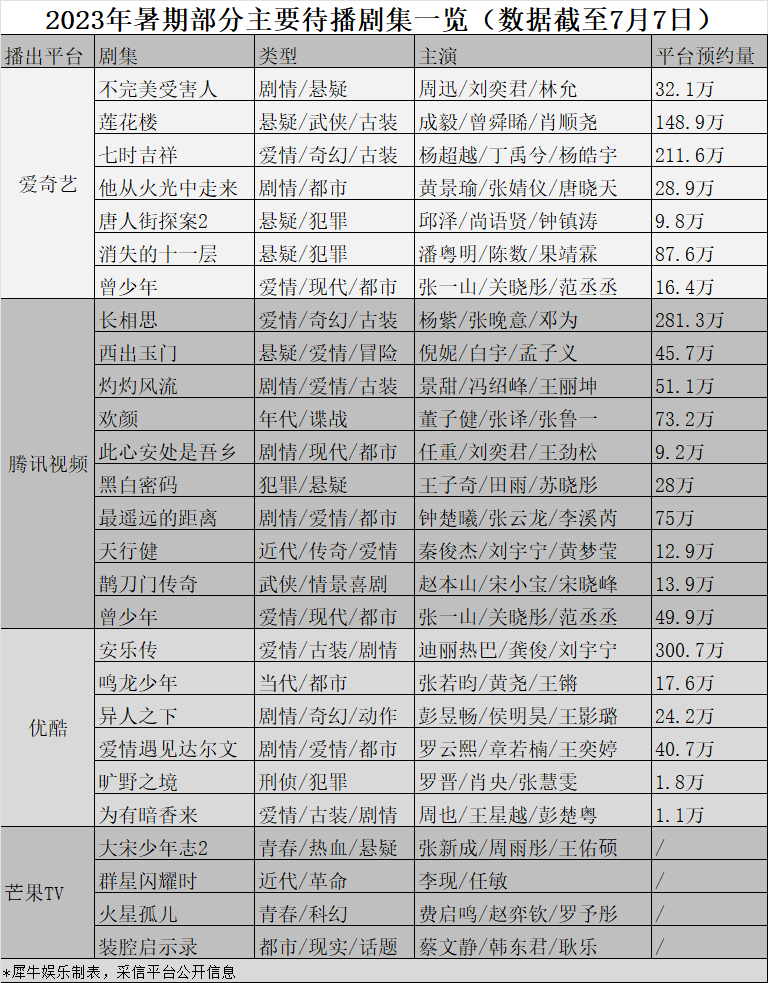 比如爱奇艺和腾讯视频的片单,整体参考了此前爱奇艺毕业季暑期档片单,和网传的腾讯视频Q3备播剧片单,但比如爱奇艺的《仿生人间》(预约量7.4万)此前曾列入“迷雾剧场”,不排除会在暑期上线。