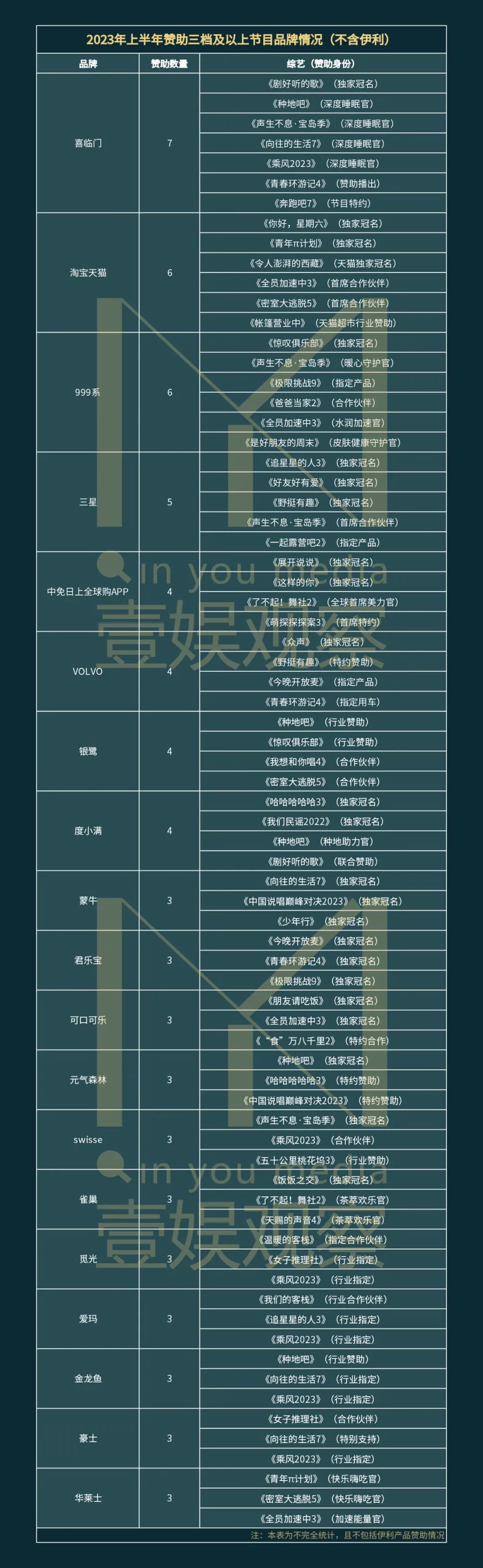 2023年上半年赞助三档及以上节目品牌情况(滑动查看)