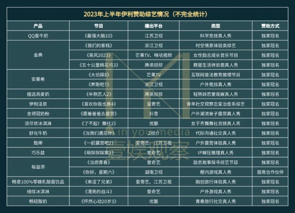 壹娱观察(ID:yiyuguancha)曾在《综艺界最大的“救世主”,是如何撒钱的?》总结过2022年上半年综艺市场赞助情况,当时,伊利就以超过15档,且绝大多数为独家冠名,并涵盖全民长寿综艺和平台S+项目,拿下当时时间段的头把交椅,在综艺寒冬之下,成为绝对的“救世主”存在。