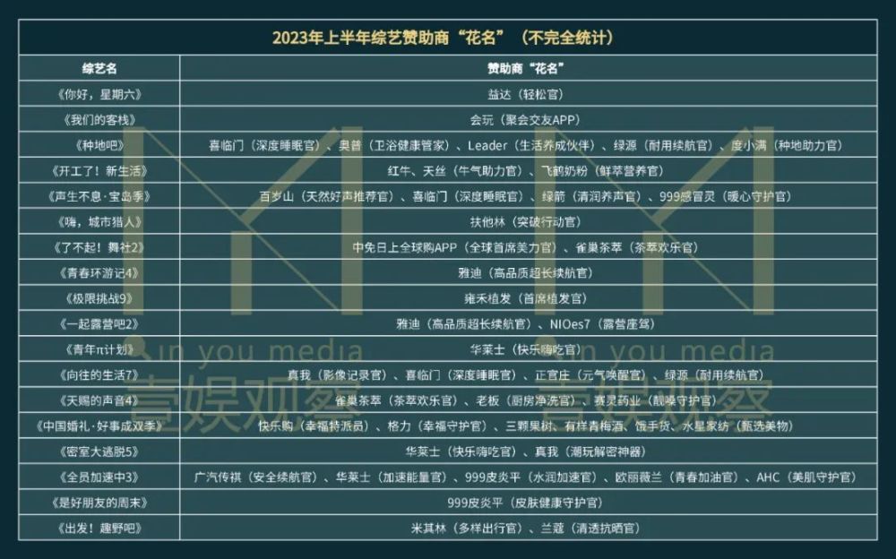 仅翻看上半年赞助商的合作title,会发现在传统的总冠名、独家冠名、合作伙伴、行业赞助等赞助方式之外,越来越多的品牌在综艺中拥有了独特的赞助名号,且相同的品牌在不同的节目的“花名”也可能会有所不同。