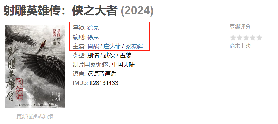 由徐克自编自导的电影《射雕英雄传:侠之大者》预计在2024年上映。