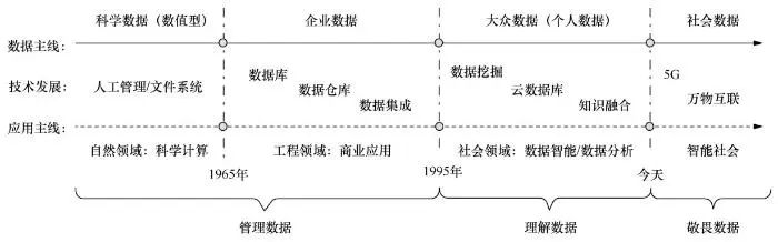 在计算机发展初期,数据通过自然观察、科学实验、统计调研等方式人为生成,多为数值型数据,人们借助计算机完成复杂的运算,促进自然发现、社会统计等学科的发展。同时,伴随着计算机存储设备的发展,文件系统、批处理等技术相继出现,人们使用这些技术对数据进行管理。此时的数据面临的主要问题更多集中于数据的正确性、共享性等应用问题。
