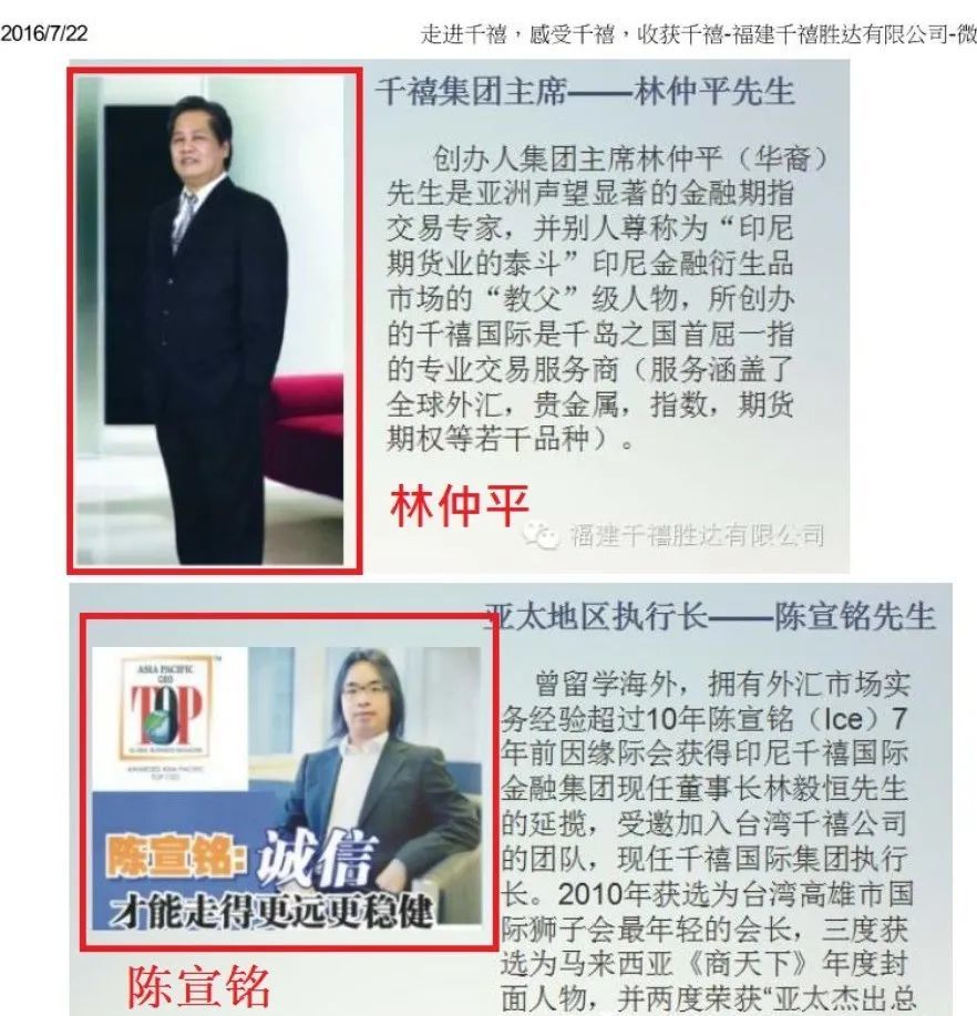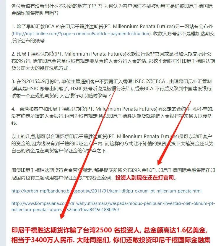 这家印尼公司(千禧国际集团),就专门去调查了一下,结果有重大发现。这家公司宣传自己成立于80年代,结果查询该公司网站才建立8个月,难道印尼是去年才有的互联网吗?早在2016年,千禧国际就在台湾推广宣传外汇资金盘,诈骗了2500名台湾同胞,诈骗金额达人民币近十亿元!而这个所谓的千禧集团实控人就两个人,都是印尼籍华裔,一个叫林仲平,一个叫陈宣铭。台湾同胞已经维权了很久,但是都没有结果。并且台湾受害者还在博客上发布了信息,提醒我们大陆同胞不要被林、陈两位操盘手骗了。但是他们也同时对大陆投资人下手了!