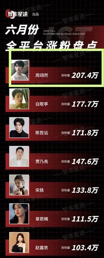 就目前结束的六月涨幅粉丝全平台数量盘点,周翊然以涨粉量207.4万遥遥领先top1,白敬亭凭借《长风渡》涨粉177.7万,紧跟其后的便是陈哲远的171.8万。