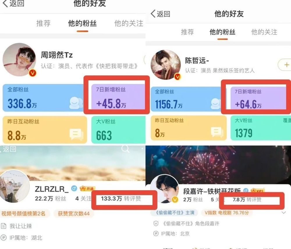 可以说单从有效播剧后的涨粉数据看周翊然PK陈哲远,明显周翊然粉丝上涨数量最多。