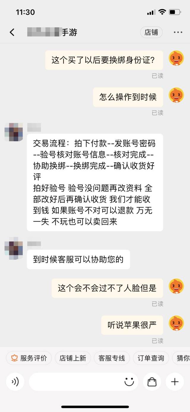 客服表示,选完号并付费下单后,门店会给用户发指定的账号和密码,用户可以用此登录游戏,并在客服的协助下自行换绑身份证信息。而当记者提出疑问,表示自己还未成年,换绑身份证后会否仍会进入“防沉迷模式”时,对方暗示记者可以“不用本人身份证”,借长辈身份证绑定游戏账号,“绝对万无一失的,后面如果不玩了你可以再卖回来。”