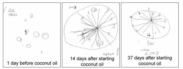 老年痴呆症的标准测试,Steve Newport从开始摄入椰子油,到第37天,画出钟表的完整度有明显进步。相关阅读→8年老年痴呆,37天就恢复,只因做了一件事……