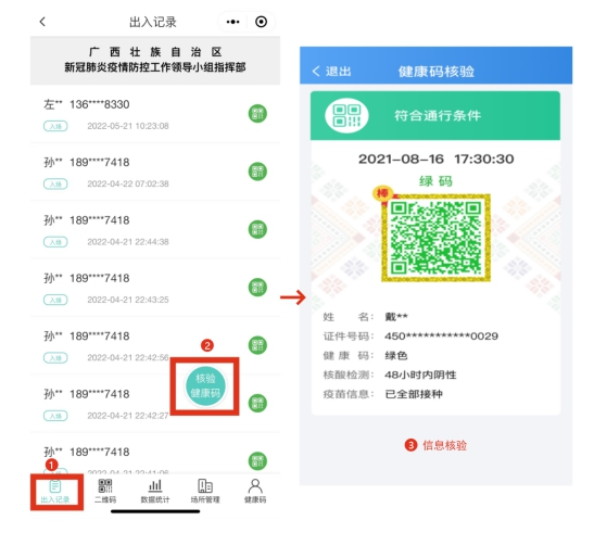 申领对象出入各类场所时需出示广西健康码凭证,由各类场所出入口管理人员现场反向扫码,核验无误后凭绿码通行,必要时核验其身份证件。