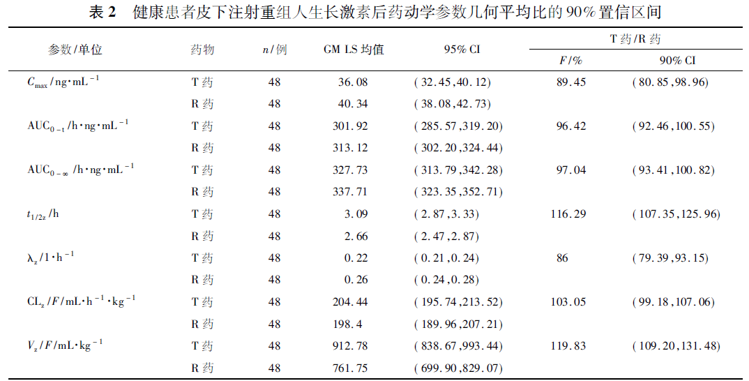 健康受试者皮下注射重组人生长激素受试制剂和参比制剂后的药动学参数的几何均数的比值完全落在80.00% ~ 125.00%之间,表明注射重组人生长激素受试制剂与参比制剂具有生物等效性,见表2?