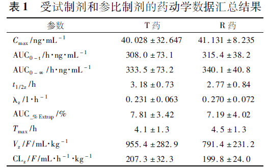 根据测得的各受试者血药浓度-时间数据,绘制血药浓度-时间曲线?用非房室模型分析药动学参数分析集数据,计算各受试者的药动学参数,包括:Cmax, AUC0 - t, AUC0 - ∞,Tmax,Vd, t1 /2,CL, Ke 等?同时计算各参数的算术?几何均数和标准差?采用线性模型进行受试制剂/参比制剂变异模型的分析?计算两药主要药动学参数( Cmax, AUC0 - t ) 的几何平均值比率的90%置信区间,并进行等效性比较,等效区间设定为80% ~ 125%?其他参数t1 /2, AUC( 0 -∞) ,Vd, Ke, CL 计算几何平均值比率的90%置信区间,Tmax采用配对秩和检验进行统计学检验?