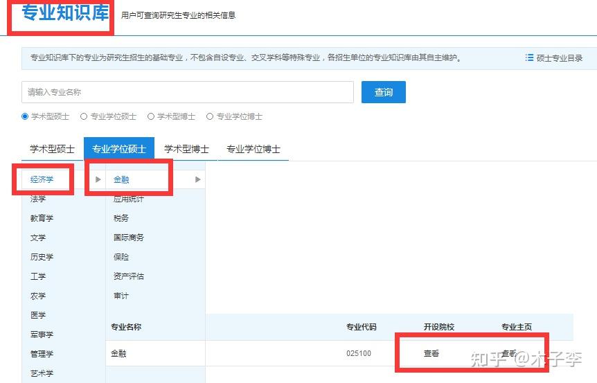 如果从专业库进去,可以查询到学硕、专硕的所有专业类别。举个例子,如果你想报考金融学专业硕士,你就选择“专业学位硕士”—“经济学”—“金融”—“开设院校”。