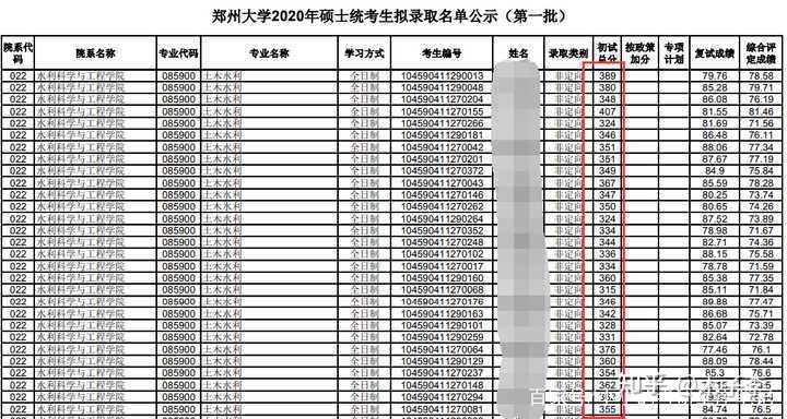 再来看2020年郑州大学“土木水利”专业的拟录取名单: