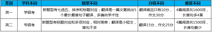(1)学科不同:一般而言,英语一是学术型专业考,英语二是专业型专业考; (2)题型不同:英语一与英语二的区别在于新题型和翻译。英语一新题型有七选五、排序和标题对应;英语二是标题对应和多项对应,相对简单。翻译英语一是一篇文章挑出5个最长最难的句子翻译,且文章多偏向学术性;英语二是一个小短文,难句不多; (3)分值不同:英语一的翻译难且只有10分,作文30分;英语二翻译15分,作文25分;文章难度不同:英语二的阅读文章4篇大概1500词左右,长难句少; (4)英语一4篇文章共1600词,长难句略多于英语二。英语二完型一篇文章350词左右,英语一完型一篇文章240-260词。考研届有一句很经典的话:“选择远远比努力更重要”,很多人每天挑灯夜战辛苦备战10个月,虽然考得很高,但是最后复试分数线都没过,还有的人初试划划水,复试却上岸了不错的学校。考研择校非常重要,在确定心仪学校之前,必须把目标院校的报录比、专业的竞争程度、复试有没有歧视、复试是不是不收二本或三本等等弄清楚,才不会像盲人摸象一样白费功夫。根据自己的能力水平,基于自己的数学、英语、专业课基础情况,然后看看经过10个月左右的时间复习后,自己能够冲击什么层次的院校,去选择一个心仪的985、211或者重点一本,全国100多所985、211以及更多的一本,总有一款适合你~