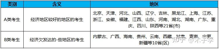 按照报考地区的不同,可以分为A类地区和B类地区,报考A类地区的考生为类考生,报考B类地区的考生为B类考生。A类考生是指经济地区较好的地区的考生,B类考生实际上经济欠发达的-些地区。