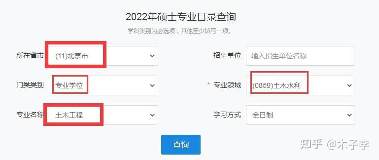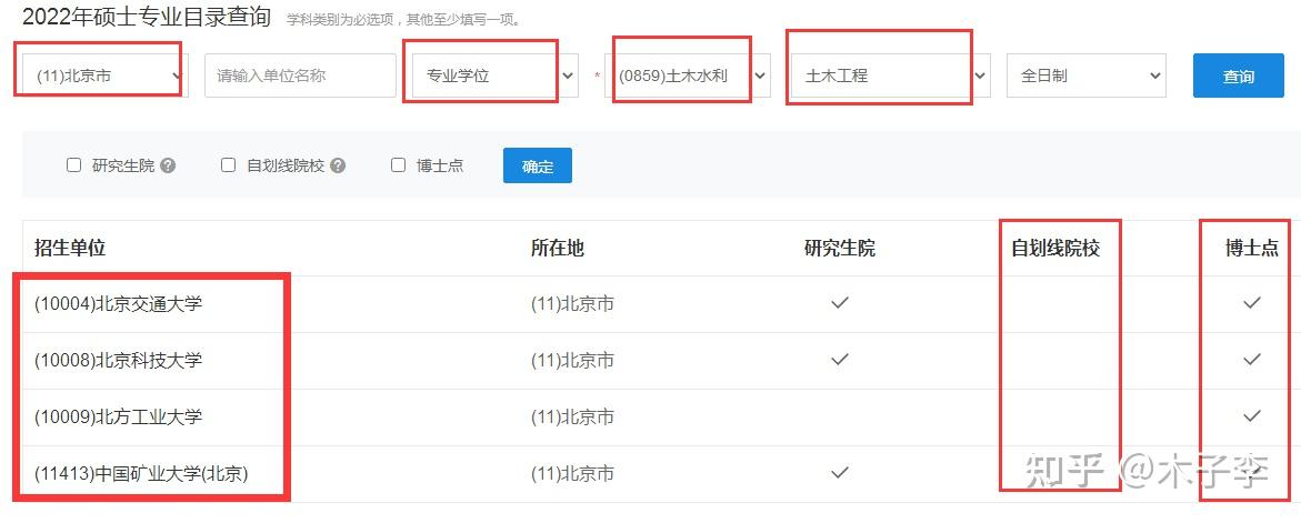 比如,我在所在省市里面输入“北京市”,门类选择“专业学位”,专业领域选择“土木水利”,专业选择“土木工程”,就可以直接进行精准筛选,筛选结果会非常准确。