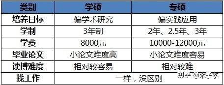 培养方式:理论上学硕是偏学术研究,研究生期间做学术较多,以写论文、发期刊、搞学术为主;专硕是偏实践应用,主要是面向就业,研究生期间做项目较多,帮导师干杂事也多。但是实际上还是看导师,和学硕、专硕关系不大,有的导师实践项目多,那么他手下的学生都会参与实践项目,专硕学硕都一视同仁;有的导师学术研究多,那么他手下学生不论学术还是专硕,基本是偏学术和论文研究。 学制年限:学硕基本都是三年,前两年要上课和帮导师做项目、做研究,第三年找工作、写毕业论文;专硕一般是2-3年,以2年居多,基本第一年上完所有的课程,顺带帮导师做事一年,第2年就要找工作毕业。 学费高低:学硕基本都是一年8000元,专硕最低10000元,部分12000元或者更高。 毕业难度:学硕毕业难度高一些,因为小论文要求比较高,比如有的专业要求至少是SCI、或者EI或者B刊......;专硕小论文要求相对更低,一般是B刊或者C刊即可。 读博难度:对于学硕而言,读博更容易些,因为可直博,也可选择考博,一般只要和导师搞好关系,并且研究生成绩不差,至少可以读自己导师的博士;专硕只能考博,难度较大。 就业前景:两个都一样,企业不会做出任何区分,企业面试只看你是全日制还是非全日制,全日制的都一样。 入学难度:不一定,不能一概而论,要看学校、专业和年份,比如:A(我小一届学弟)报考了某个院校的学硕研究生,分数是350多;B报考了同一个院校同一个专业的专硕研究生,320多,两人复试成绩都挺好,但是B考上了,A被刷了。因为那一年专硕招收名额是12个人,学硕招收人数是10个人,但是其中有6个保研的,也就是只招4个人。