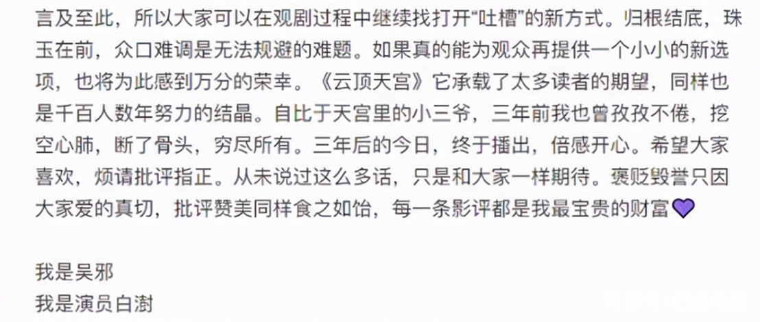 通篇都在努力卖惨,自己为了完成吴邪这个角色,挖空心肺、断了骨头,穷尽所有,但太多客观因素不能抵挡,所以希望尽管珠玉在前、众口难调,大家也能包容度高点。