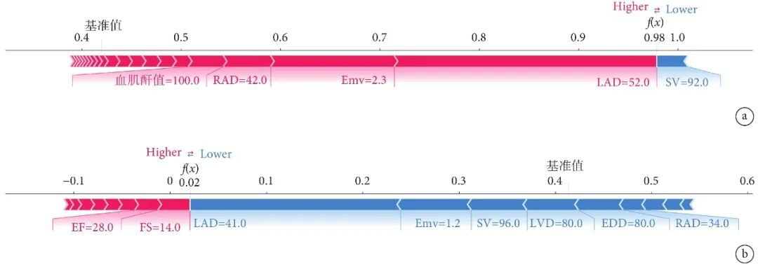 SHAP算法计算出每个样本的预期SHAP值,取其平均值作为单个实例的基准;图中的每个特征被用作增加或减少基准值的驱动因素;红色特征增加了患者患房颤的概率,而蓝色特征则相反。此外,特征条的长度表示该特征的影响强度;a:1例瓣膜性房颤患者示例;b:1例无瓣膜型房颤患者示例
