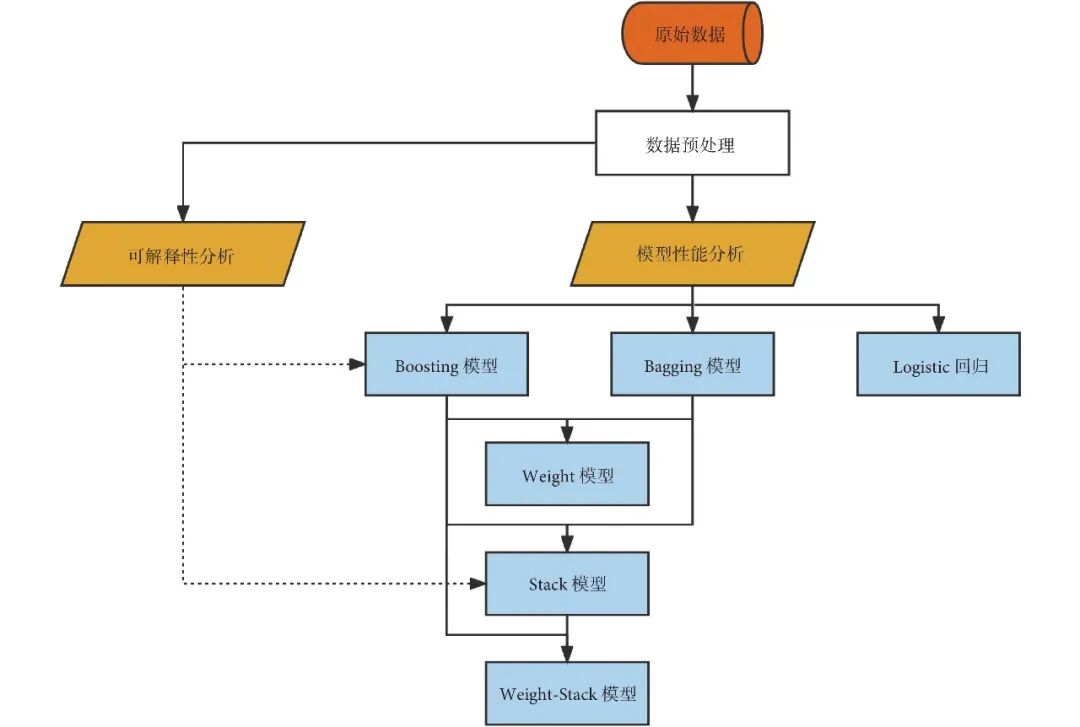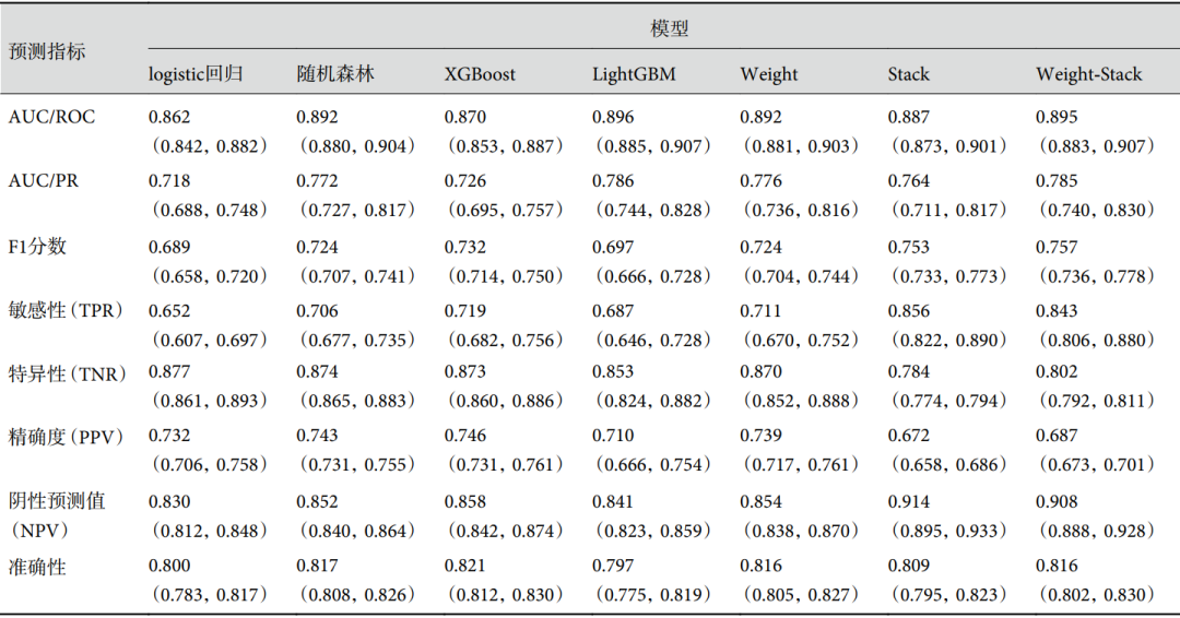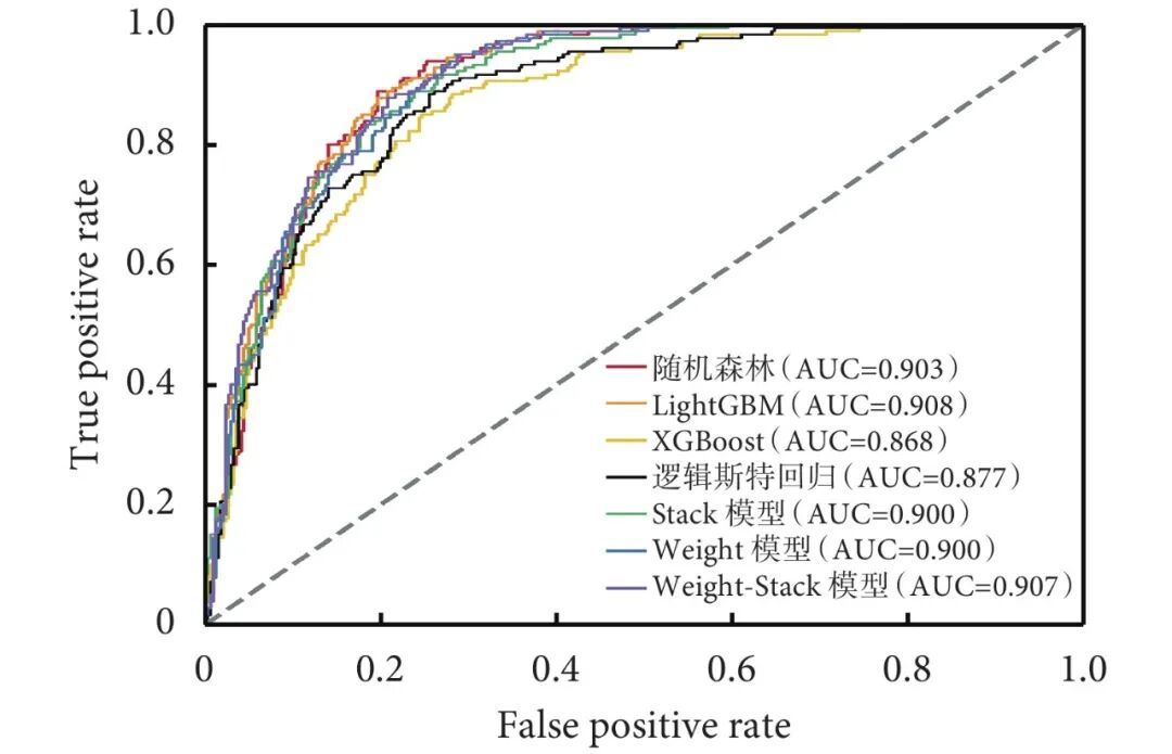针对结构化类型的数据,我们选择了3种基于Bagging[17]或Boosting[18]方法的标准监督机器学习模型。随机森林(random forest,RF)[19],XGBoost[20],LightGBM[21]与3种集成机器学习模型:Weight模型、Stack模型、Weight-Stack模型。标准机器学习模型是通过调用Python中的开源包得到的:Scikit-Learn 0.24.1版,XGBoost 1.4.2版,LightGBM 3.2.1版。在此基础上,我们建立了结合Bagging和Boosting方法的集成模型,以达到更好的预测性能,并保持良好的可解释性。此外,我们使用统计学中的经典logistic回归模型作为性能参考。