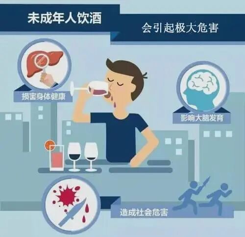 未成年人正处于心理和生理发育的关键时期,与成年人相比他们比成年人对酒精更加敏感。未成年人饮酒可致神经发育受阻,影响认知和行为功能,对大脑结构和功能产生潜在持久的不良影响。未成年人饮酒除了对身体的损害,还会增加相关意外伤害的风险,如吸烟、交通事故,暴力外伤等。