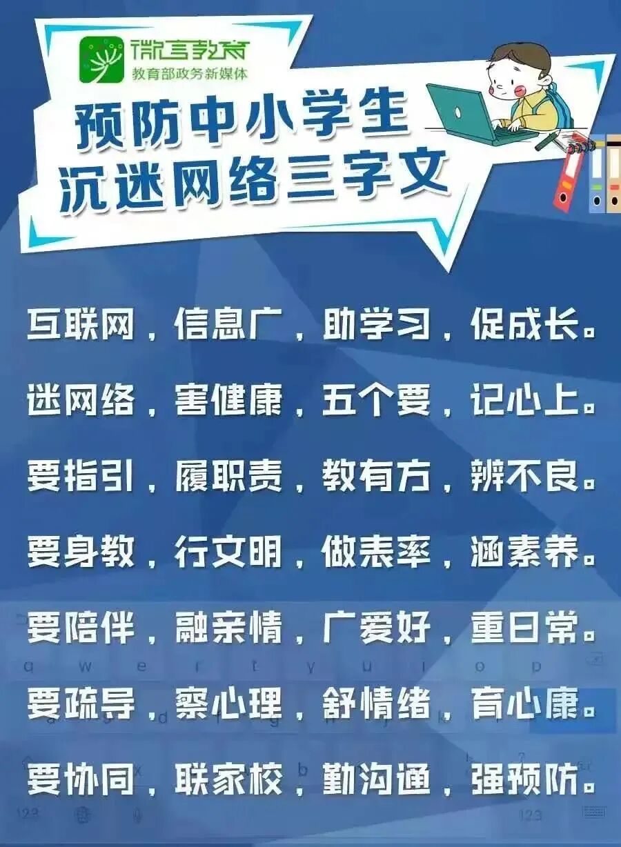 教育部发出《致全国中小学生家长的一封信》,引导家长积极、快速行动起来,有效预防中小学生沉迷网络。信中还有“防迷网”三字文,朗朗上口,便于记忆。一起学习↓↓↓