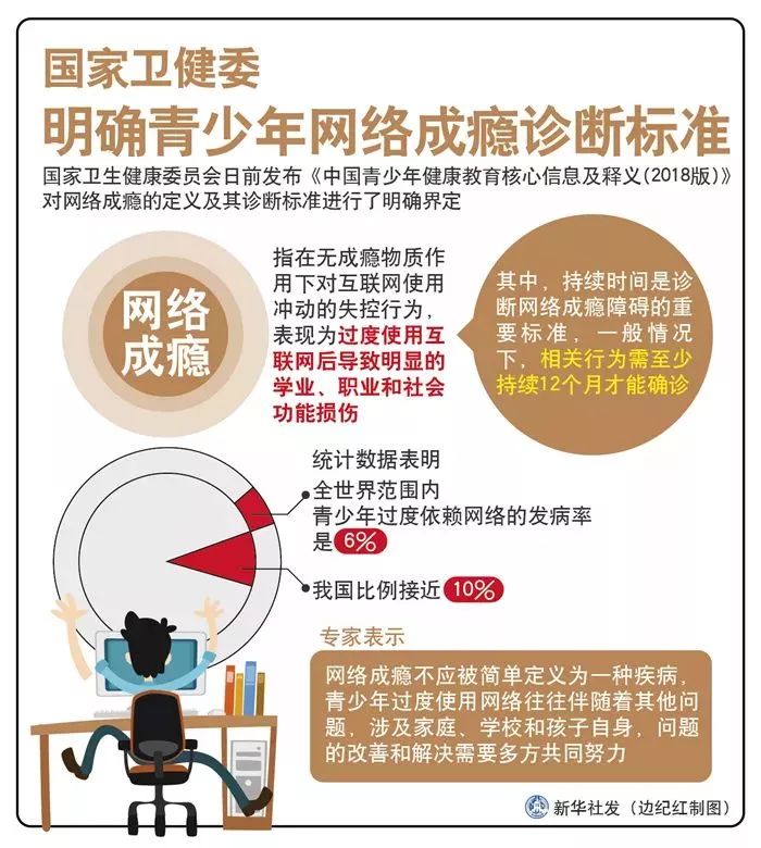 根据《中国青少年健康教育核心信息及释义(2018版)》,网络成瘾指在无成瘾物质作用下对互联网使用冲动的失控行为,表现为过度使用互联网后导致明显的学业、职业和社会功能损伤。其中,持续时间是诊断网络成瘾障碍的重要标准,一般情况下,相关行为需至少持续12个月才能确诊。
