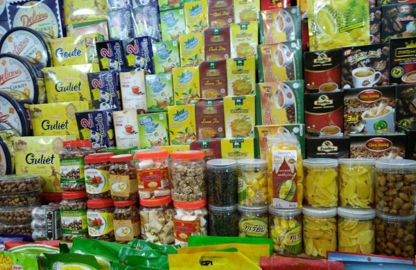 越南的零食。这里的商品琳琅满目,但是每一家的商品种类都差不多。有越南当地的衣服、帽子、人字拖鞋,有咖啡、干果、面包、饼干、香烟,也有玉石、珠宝首饰、沉香木、紫檀香以及生活必需品,一些小零食、小部件、稀奇古怪的玩具和手工艺品应有尽有,让人眼花缭乱。