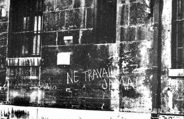 德波在公寓墙上的涂鸦“永不工作”是在1953年完成的,而在1968年时这句话成为了五月风暴的口号之一。五月风暴后的1973年,德波发表了他的重要电影作品《景观社会》,B站能看到。