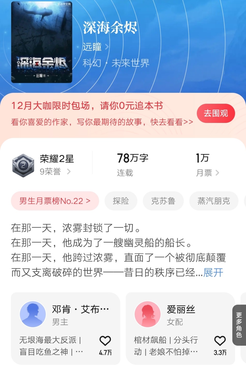 另外《深海余烬》自从七月上线到现在快五个月了,上线之后,远瞳基本都在双更,比以前勤快了很多,小说成绩也是写作以来表现最好的一本,未来有很大希望突破十万订。