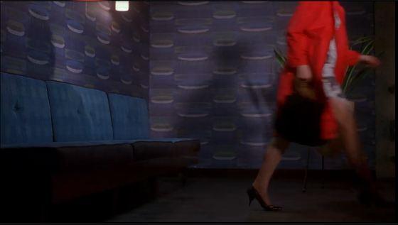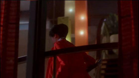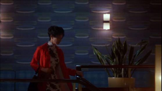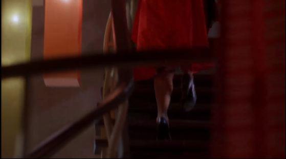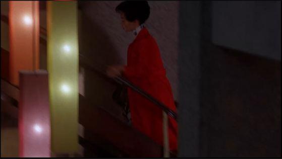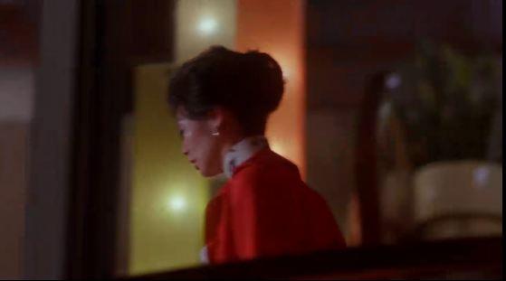 这四个镜头是以快切的方式完成的,加到一起的时间也不过3秒钟。通过这几个快切镜头以及高跟鞋声的放大表现,把张曼玉的急切心理再次强化了出来。同时,与在汽车上的固定镜头不同,这四个镜头里都是包含着运动的。换句话说,一是情绪表现上的再次加强,二是完成了由“静”到“动”的视觉节奏变化。