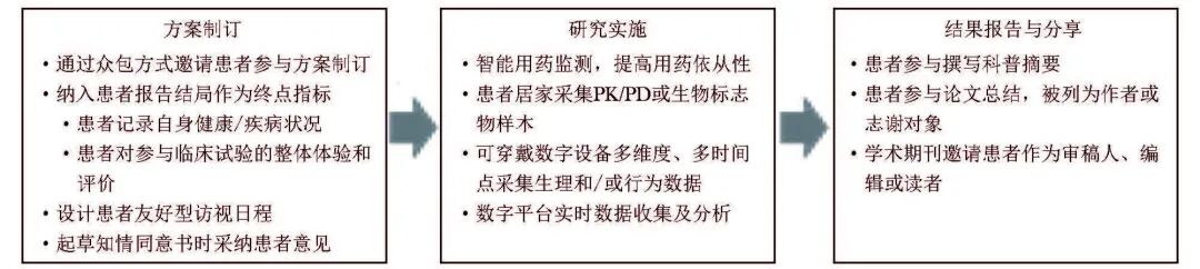 临床试验全流程如何以患者为中心一直是研究的重点,梳理现阶段以患者为中心的临床试验的实现大致分为研究方案制订、研究实施、结果报告与分享3个阶段(图1)。