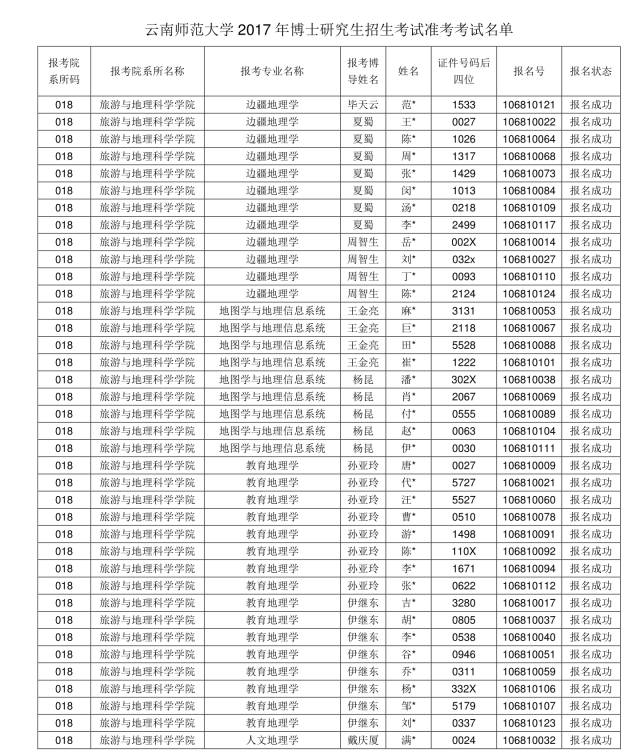 云南师范大学2017年博士学位研究生考试准考考生名单