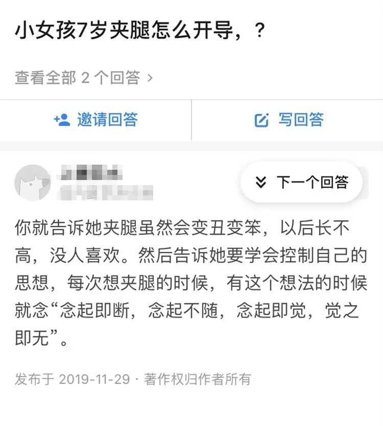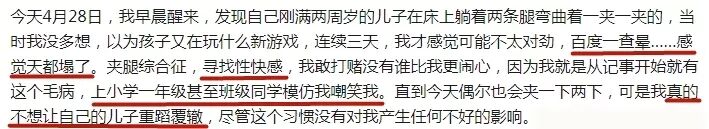 自己经历过同样的事情,也同样因为这些经历带来的强烈自卑感加深了她对夹腿这件事情的厌恶和憎恨,于是这种自卑有可能因为这位家长的错误处理继续传给下一位孩子。