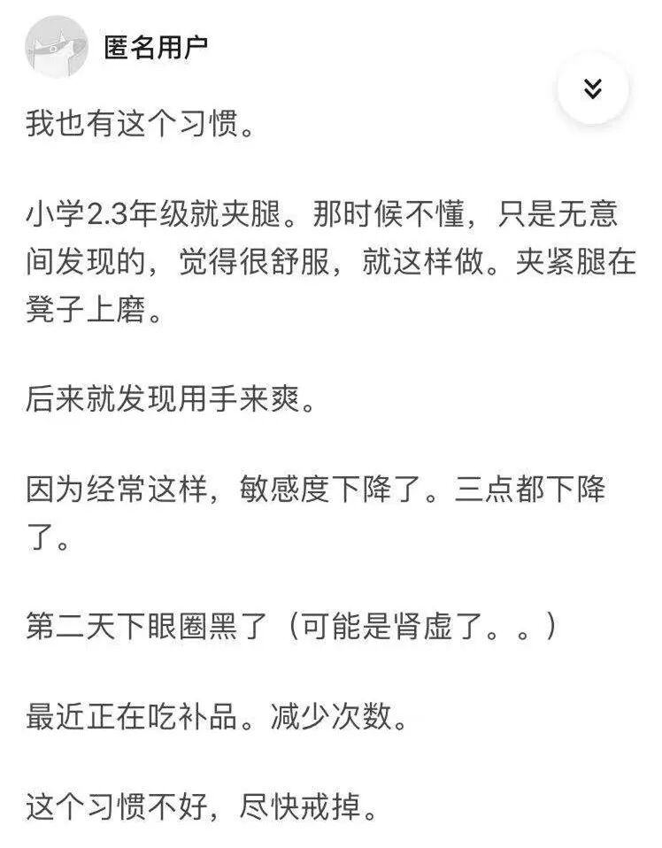 虽然我也没搞明白回答中说的“三点都下降了”指的是哪三点,但简单粗暴的总结一下,答主已经将夹腿这件事划分为了“不好的习惯”,对身体危害多多,需要戒掉。