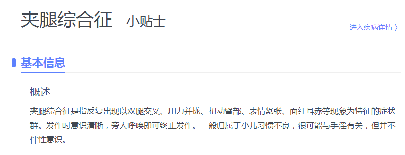 夹腿综合征不是病,更不代表着性早熟,它只是我们在成长过程中,一种单纯的好奇心,一种对未知的探索过程。它与性欲、淫邪、羞耻无关。