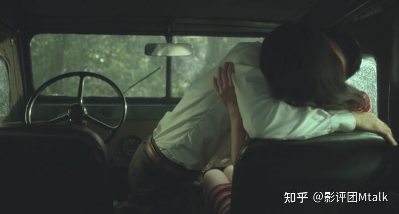 车外滂沱的大雨、郊外浓郁苍翠的绿林、潮湿的天气,都对映着车内密闭空间,男女之间澎湃的情欲流动。