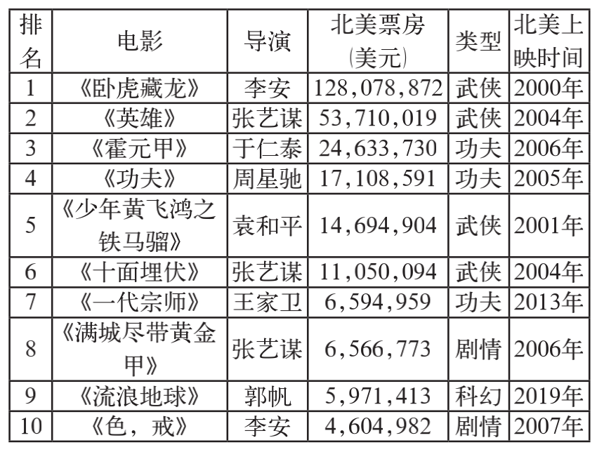 在当代提及华语电影,传播最广、知名度最高的电影类型之一就是武侠/功夫片。(11)21世纪以来,在北美票房排名前10的华语电影中,前8名无一例外为武侠/功夫片(见表1)。其中,《卧虎藏龙》傲居北美外语片总榜榜首,院线票房超过1.28亿美元,音像制品营收突破1.12(亿)美元。(12) 表1.2000—2020年华语电影北美票房排行榜TOP10(13)