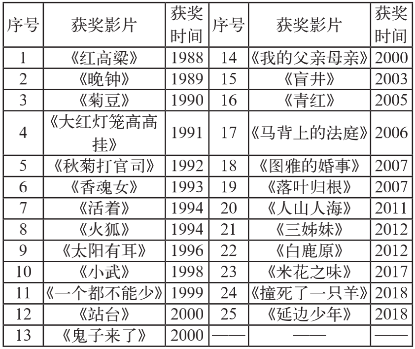 表3. 1988—2020年在欧洲三大国际电影节上获奖的华语乡土题材电影