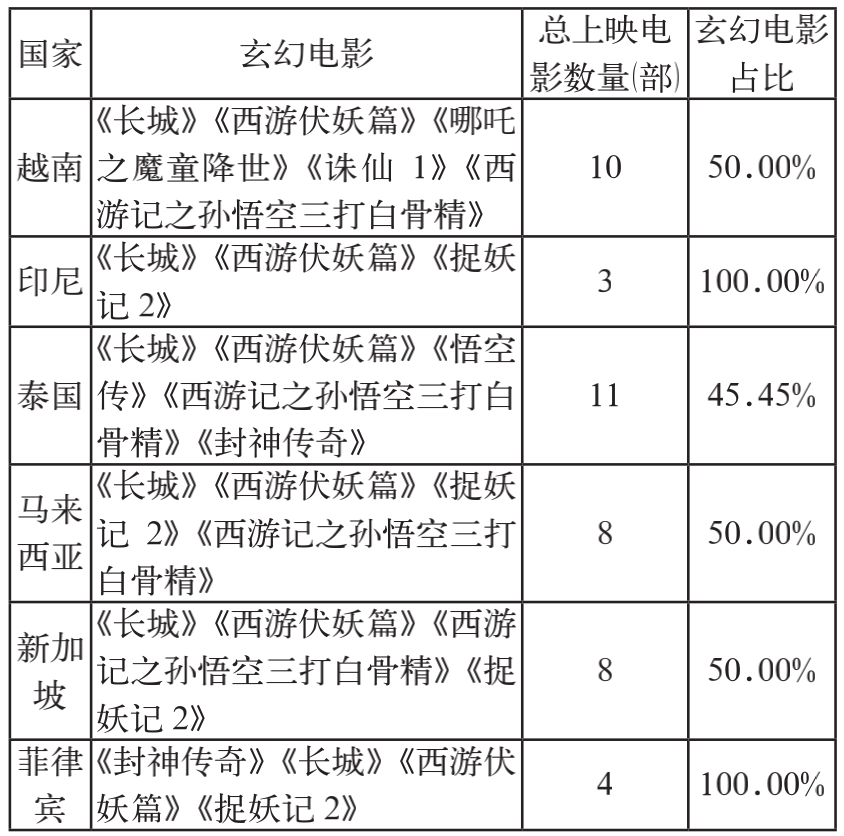 玄幻电影在海外拥有为数不少的异国“粉丝”,是华语电影“走出去”的重要一支。如表2所示,2016—2020年,在越南、泰国、马来西亚、新加坡上映的华语电影中,玄幻题材占据半壁江山;在印度尼西亚和菲律宾上映的所有华语电影则皆为玄幻题材。从票房来看,近五年来,两部玄幻电影海外票房超过千万(美元)级别,分别为《妖猫传》和《哪吒之魔童降世》,六部超过百万(美元)级别。其中,《妖猫传》的海外票房高达1296万美元,约为中国内地票房的五分之一。可见,玄幻电影声名远播,有着广泛的海外受众基础。