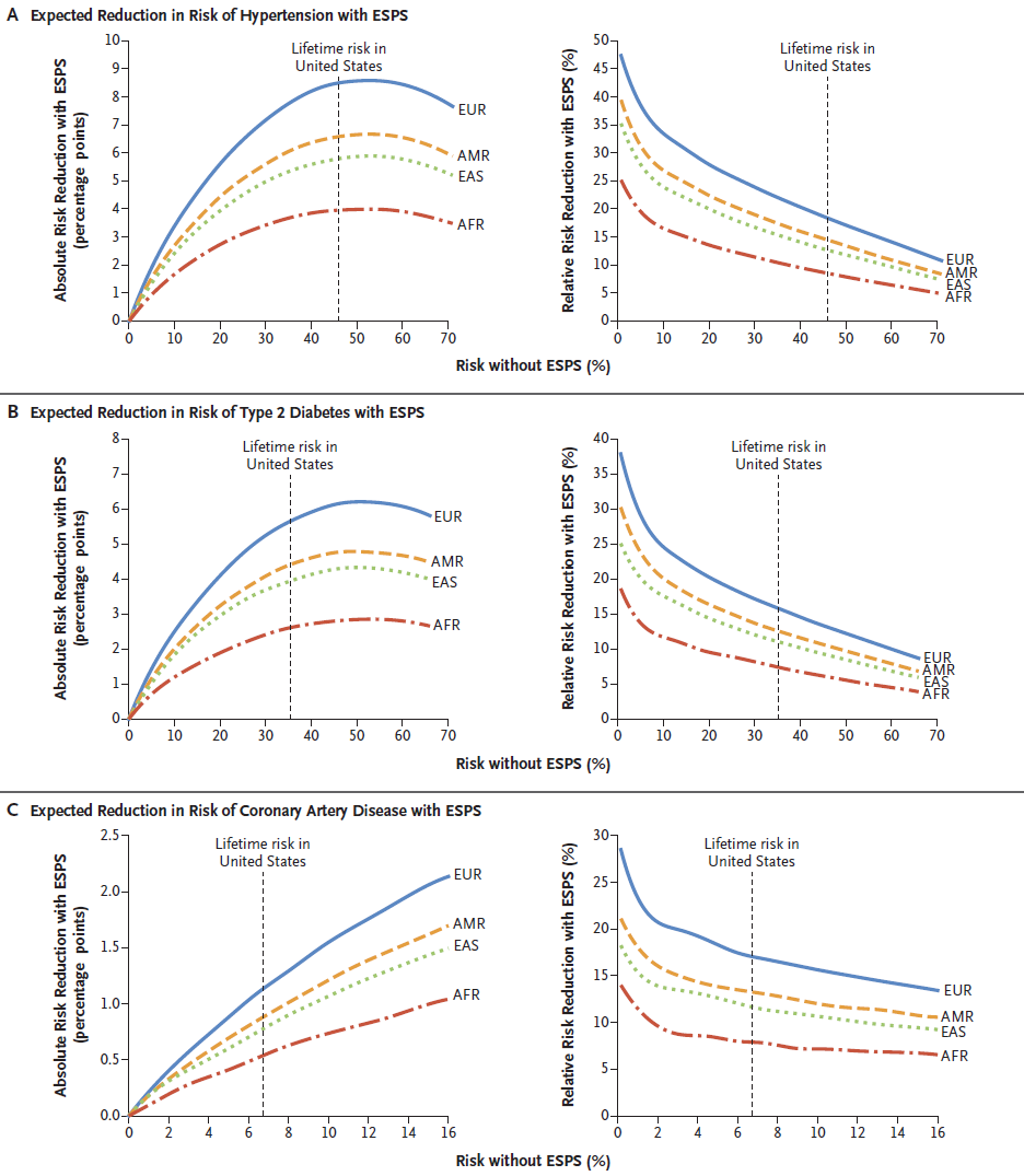 此外,目前通过全基因组关联分析建立的多基因评分标准,大多是基于欧洲人口建立的,对其他地区的人口适用度不足。例如,通过多基因评分对高血压、2型糖尿病和冠状动脉疾病风险的预测,可以明显看出,在欧洲人群中最显著,在美国、东亚、非洲,依次降低。