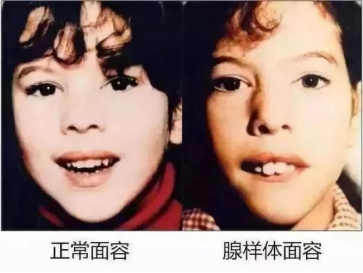 什么是腺样体面容 “腺样体面容”,指的是腺样体肥导致鼻咽部通气不畅,长期张口呼吸,而形成上颌骨变长、硬腭高拱、上切牙突出、唇厚的面容特征。