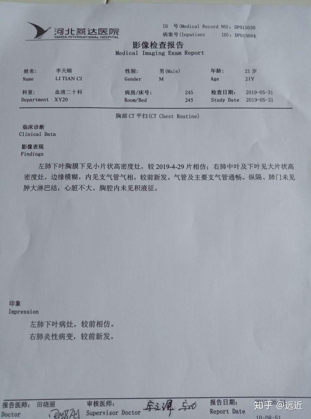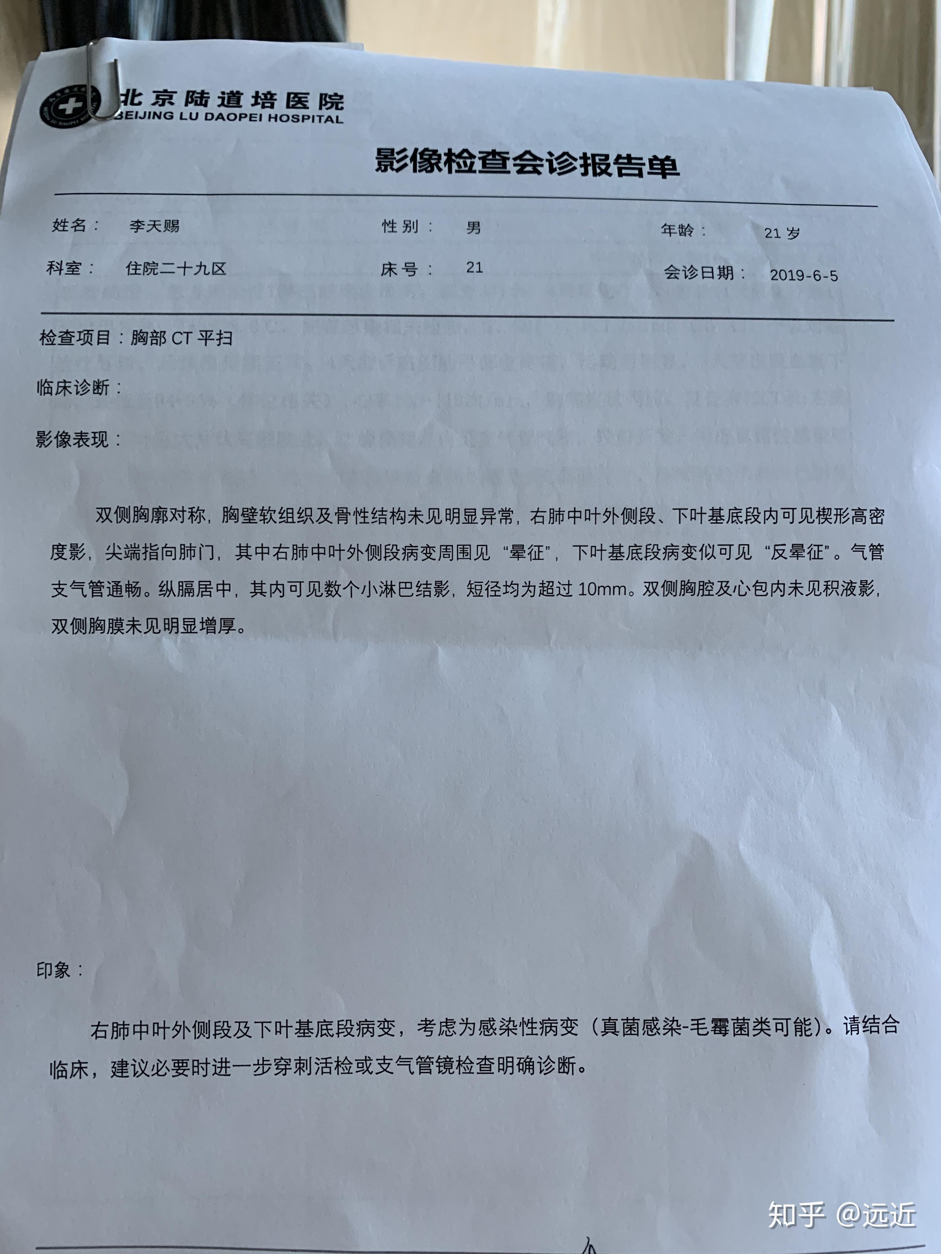 上次CT结果出来了,陆道培医院的大夫不敢确诊我肺部是不是真菌感染,不敢让我进仓,怕死在仓里。要我下周一去天津血研所做肺部进一步检查。