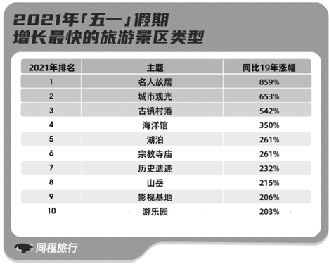 2021年“五一”假期,名人故居类景区受到了年轻游客追捧。而“CITYWALK”(城市漫步)等新潮玩法,带动了城市观光类景点门票订单上涨,标志性高层建筑的观景台成为年轻游客拍照打卡的热门选项。海洋馆、游乐园等亲子游热门景点也迎来大幅上涨。