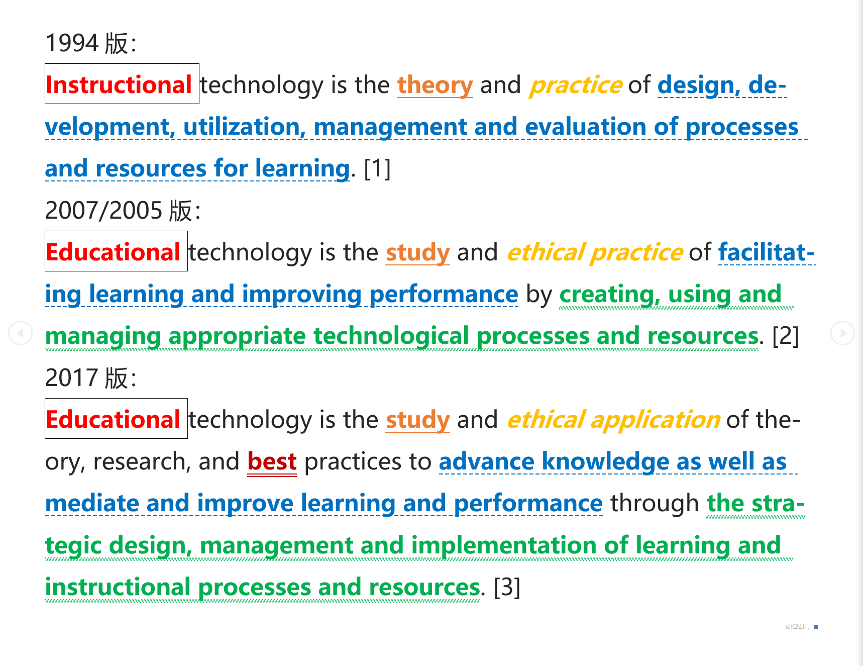 第四,深红色字体best(或双下划线文字)。best是最高级,这个词原来没有,现在加在practice之前,表明AECT希望能从多个实践方案中挑选出最佳选项。我想这也是为了能最大程度地实现正向的(positive)、符合伦理道德的(ethical)效果。