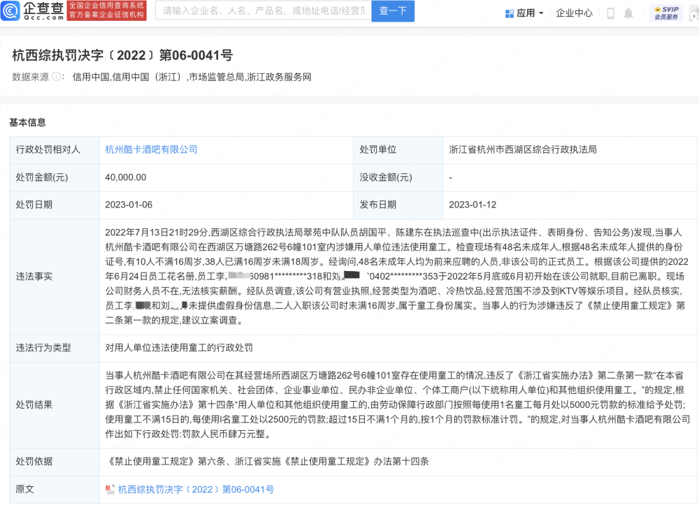 企查查APP显示,近日,杭州酷卡酒吧有限公司因违法使用童工被罚款4万元。
