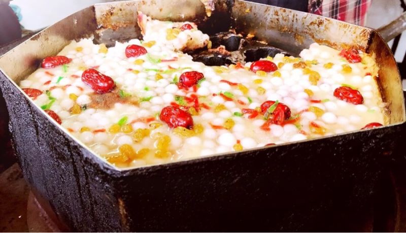 ▲ 一层面糊,加一层豆沙,再一层又一层地撒料,小元宵、红枣、青红丝、葡萄干,光是制作过程就把人看得口水直淌。